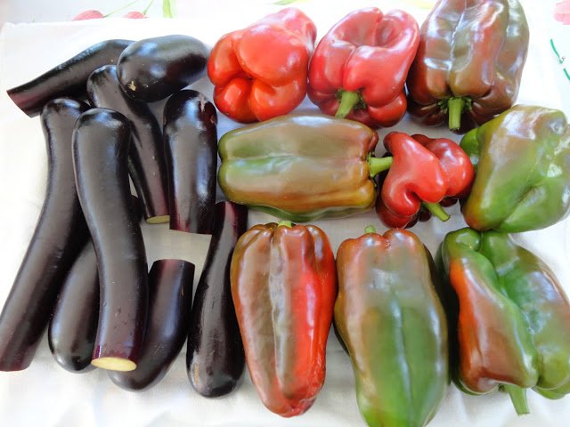 En una bandeja para horno colocamos una hoja de aluminio y sobre ella colocamos las berenjenas y los pimientos morrones. Llevamos al horno a una temperatura de 375 grados, por unos 20-30 minutos.