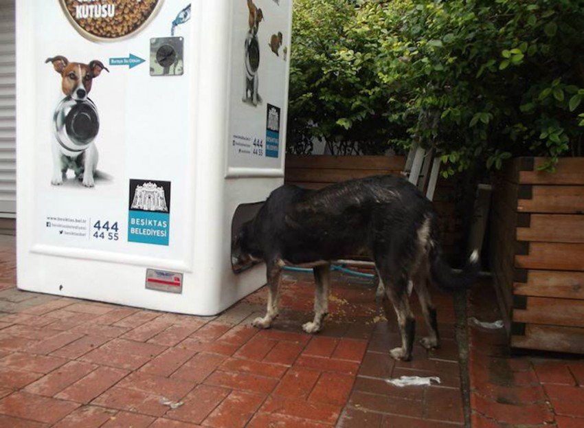 Se trata de una máquina que convierte nuestras botellas de PET en alimento. La máquina funciona de la siguiente manera: El agua que nos sobra se vierte por un hueco que tiene la máquina; esta cae en un recipiente en el que los perritos de la calle pueden beber. La botella vacía va a la máquina para que mediante el reciclaje de las mismas botellas se pueda obtener el dinero necesario para comprar el alimento que expende la máquina.