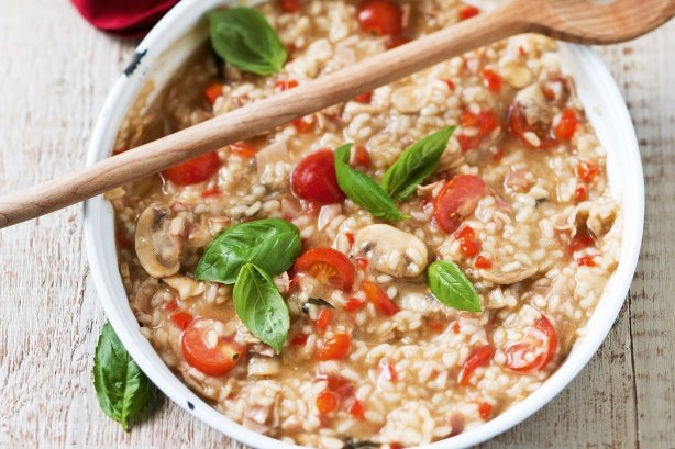 En una olla colocar la mantequilla y agregan la cebolla picada, dejar que la cebolla se cocine por un par de minutos. Luego se agrega el arroz y se mezcla bien con las cebollas, pasado otros 2 minutos se agrega la la ½ taza de vino y se deja evaporar el vino por lo menos unos 45 segundos. Agregamos sal y pimienta al gusto.