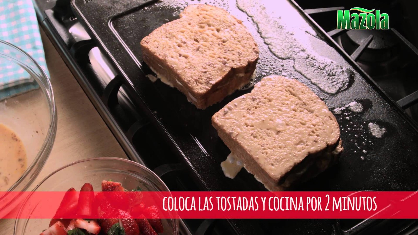 Derrita Margarina Mazola en la plancha a fuego medio. Pase las tostadas por la mezcla de huevos y coloque a la plancha caliente. Cocina por 2 minutos, voltea y cocina por 2 o 3 minutos adicionales. Aplasta bien y retira del fuego, corta en mitades y sirva con las fresas maceradas.