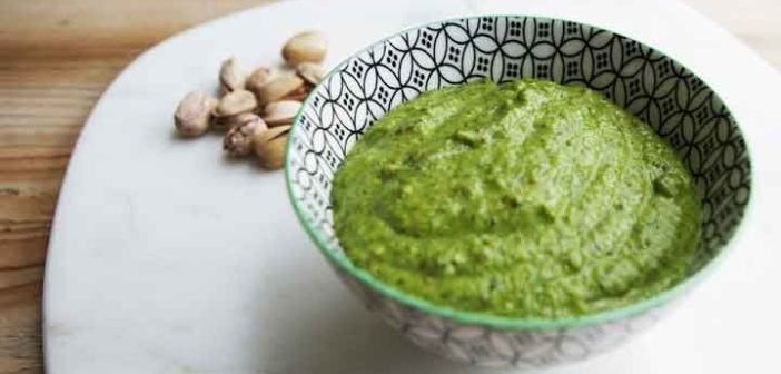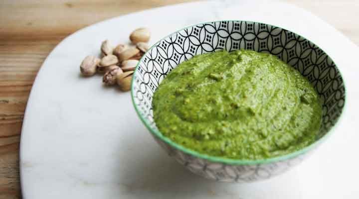 En un procesador agregamos los pistachos y los piñones con una pizca de sal y procesar hasta formar una pasta. En movimiento, agregar poco el aceite de oliva hasta que se forme una pasta ligeramente líquida. Retira del procesador, agrega la pimienta molida y mezcla.