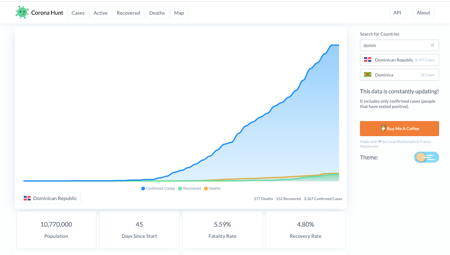 Corona Hunt es una web que apuesta por mostrar las curvas de casos, recuperaciones y muertes en cada país, lado a lado, para que sea posible ver qué países se están recuperando y cuáles están pasando por los peores momentos. En el menú superior de Corona Hunt  podemos elegir el tipo de información que queremos ver: casos, muertes, recuperados, activos y mapa. La ventaja de poder ver toda la información al mismo tiempo ayuda a entender cómo las decisiones de confinamiento de cada lugar tienen más o menos eficacia. Es posible ver la curva de muertos disminuyendo en algunos países de Europa, mientras que en América Latina y en Estados Unidos parece seguir subiendo exponencialmente. Si usamos el buscador del menú derecho podemos encontrar detalles de países específicos, con las mismas curvas y algunos gráficos más detallados mostrando los aumentos día a día, siempre con los datos confirmados por cada zona.