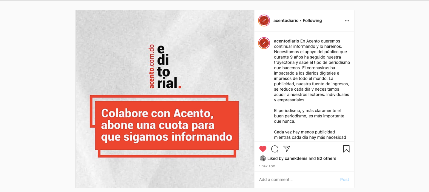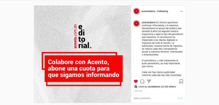 En Acento quiene continuar informando, pero necesitan el apoyo del público que durante 9 años ha seguido su trayectoria y sabe el tipo de periodismo que hacen. El coronavirus ha impactado a los diarios digitales e impresos de todo el mundo. La publicidad, su fuente de ingresos, se reduce cada día y necesitan acudir a los lectores. Individuales y empresariales.